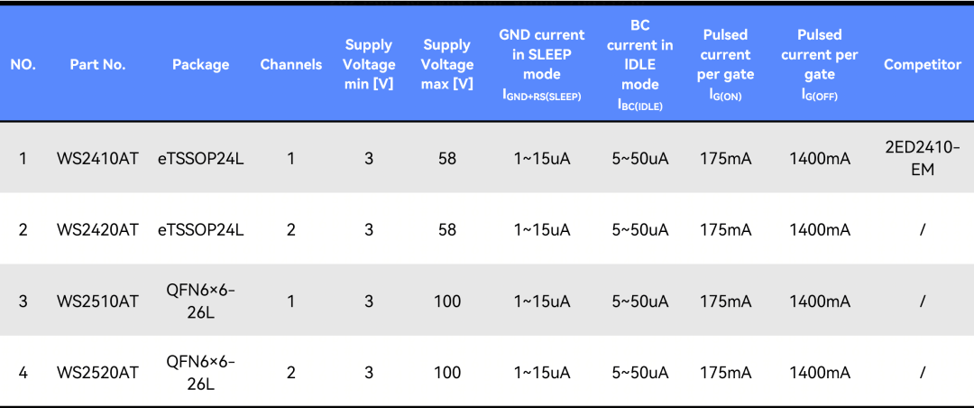 WS2510AT/WS2520AT:QFN 封裝,耐壓 100V,適用于高壓 BMS、DC-DC 轉(zhuǎn)換器等新能源汽車核心部件;